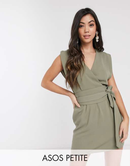 ASOS DESIGN Petite split sleeve cap sleeve wrap mini dress with obi belt in sage green Very well made.