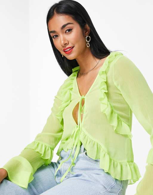 ASOS DESIGN tie front frill neck sheer blouse in lime Very well made.
