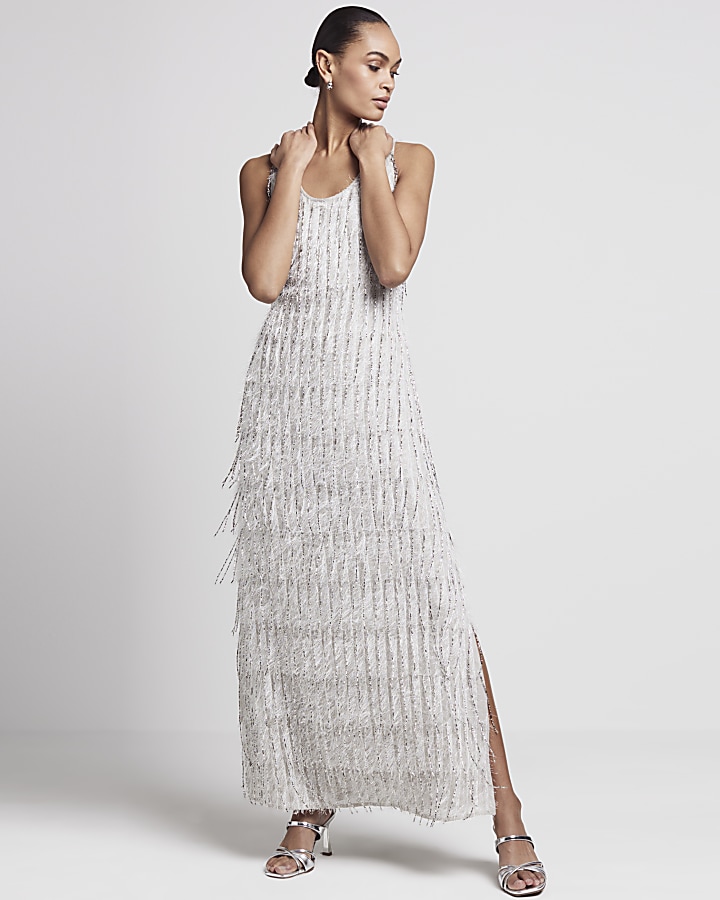 Grey fringe embellished bodycon maxi dress Very well made.