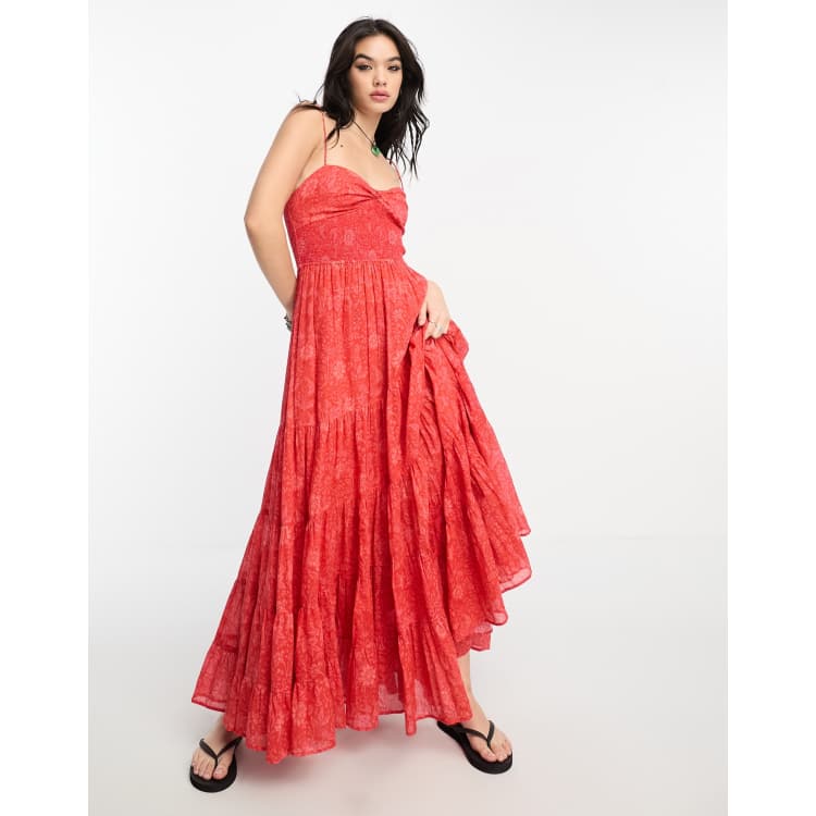 Free People floral print strap detail tiered maxi dress in pink and red Very well made.