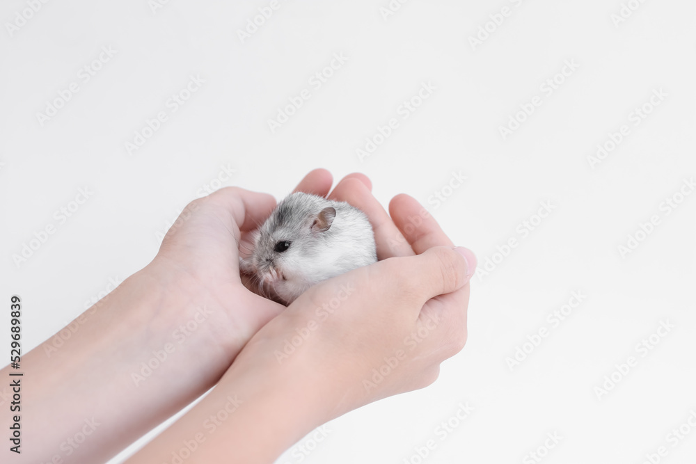 A little cute fluffy white domestic hamster sits in the arms of a Very well made.