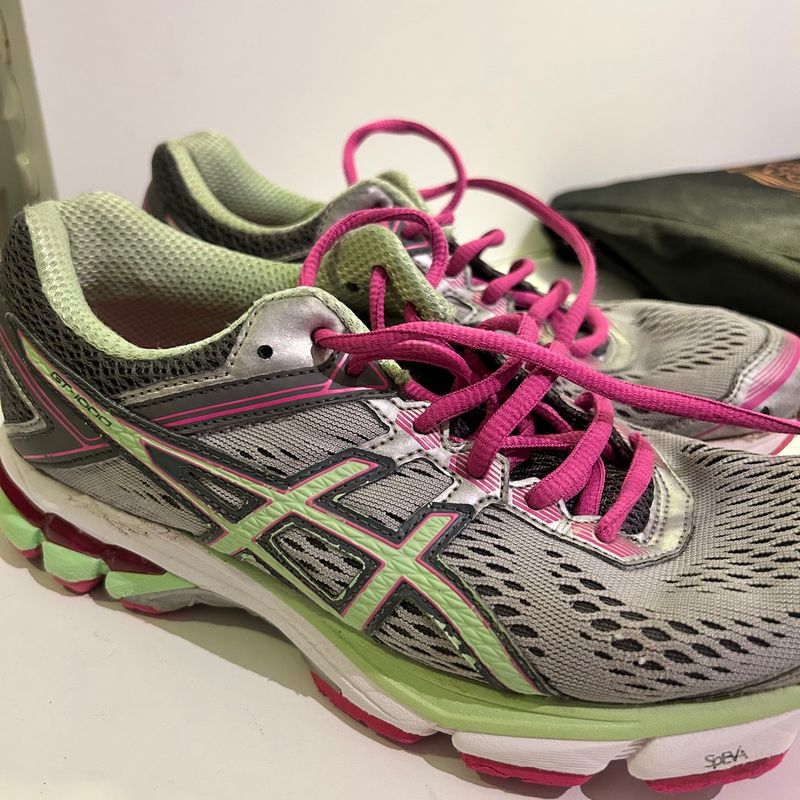 Tenis Asics Cinza com Detalhes Verde e Rosa T nis Feminino Asics Very well made.