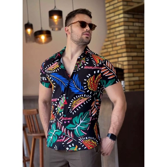 Camisa Masculina Estilosa Moderna Estampada Florida Casual Manga Curta Com Bot es Tamanhos PP Cores Preto Very well made.