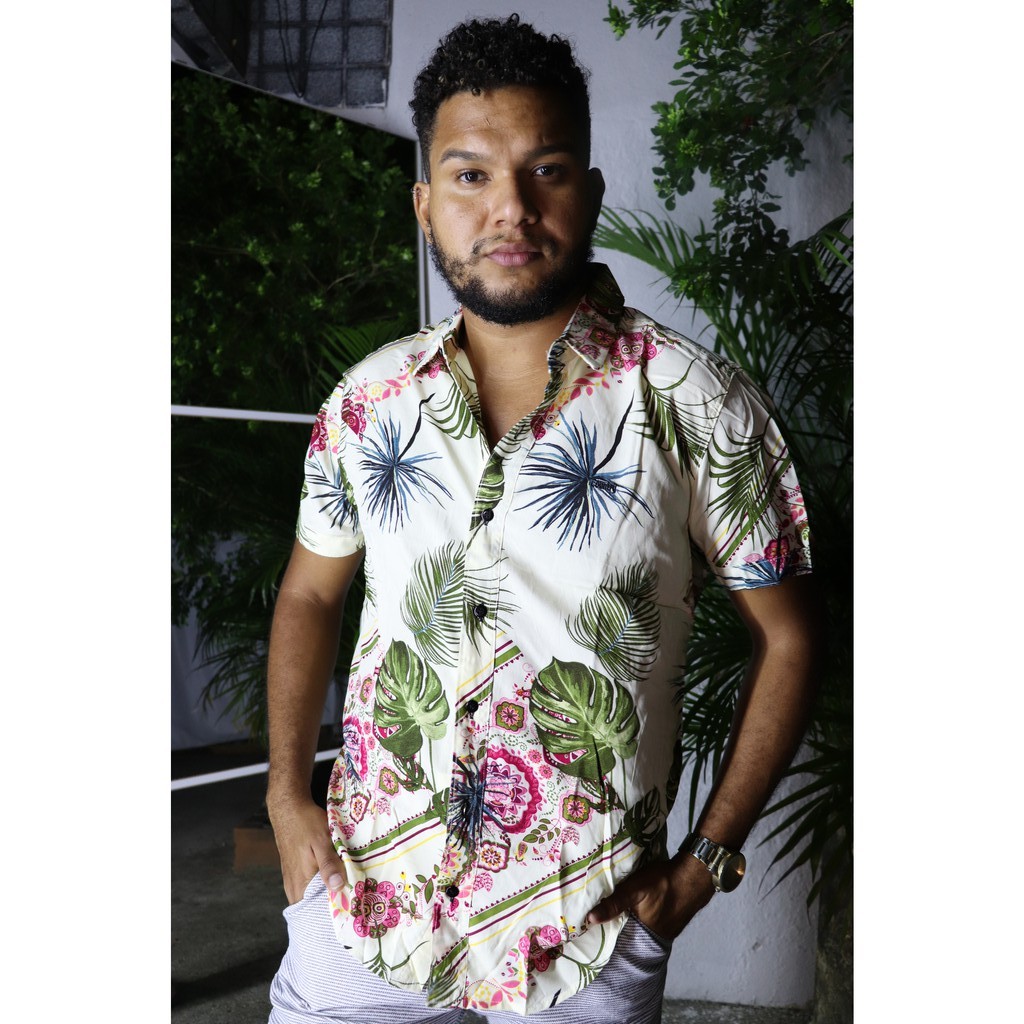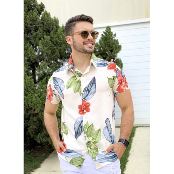 Camisa masculina de bot o manga curta florida de viscose Very well made.