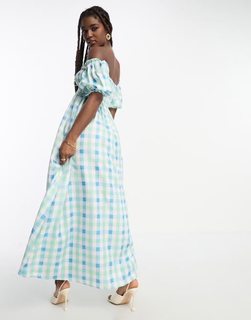 The Frolic check off shoulder shirred maxi dress in blue Very well made.