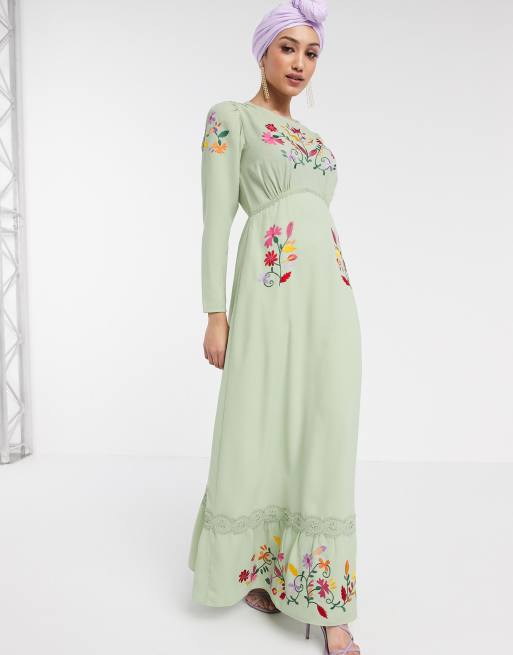 ASOS DESIGN embroidered maxi tea dress with long sleeves in sage Very well made.