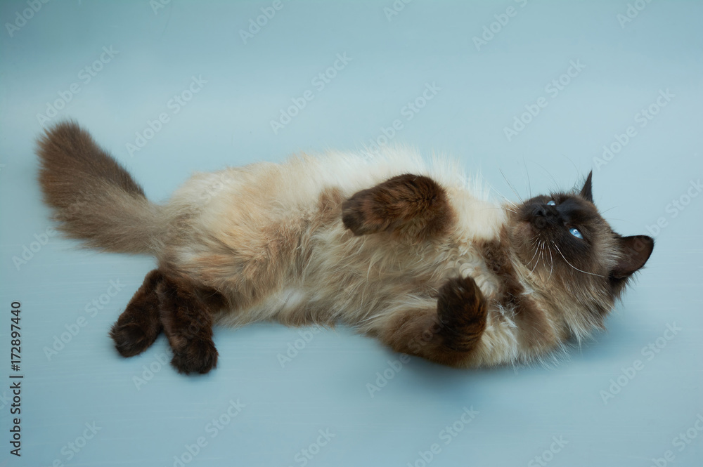 A cat of the Balinese rock spreading paws lies on a gray Very well made.