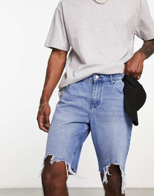 ASOS DESIGN slim regular length denim shorts with rip hem in mid wash blue Very well made.
