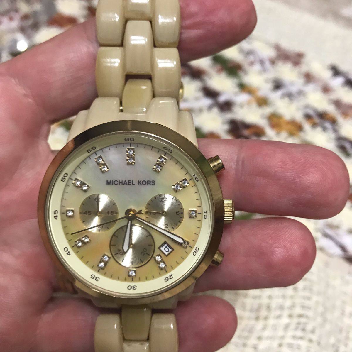 Michael Kors Ritz Watch Women Cream Chronograph Date Horn MK 5217 new battery Very well made.